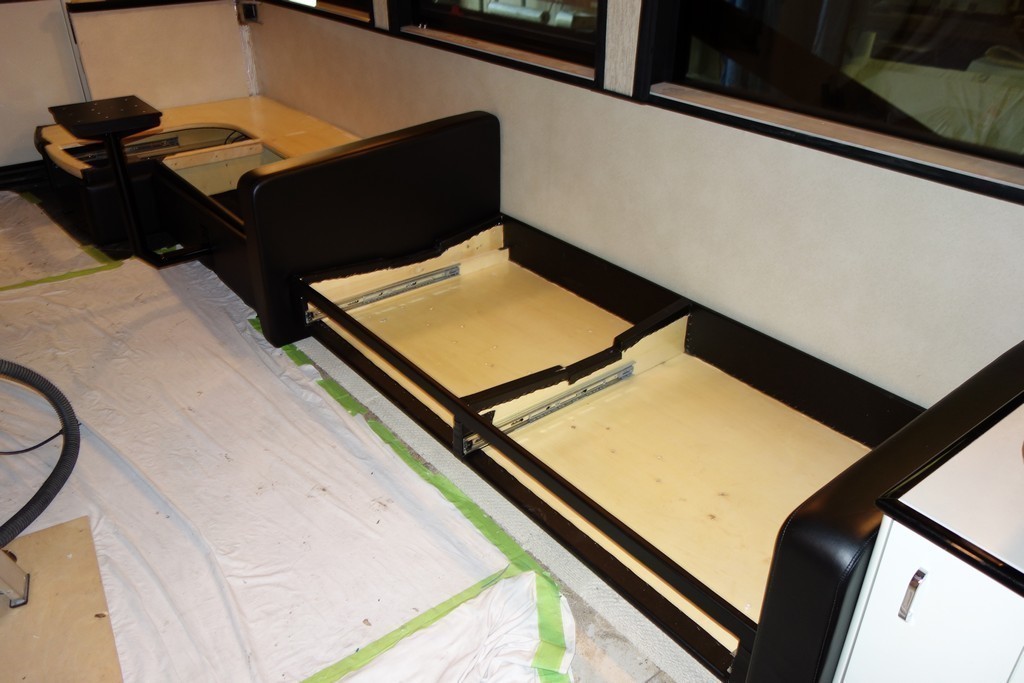 008 Prevost XLII Salon slide being put back together with new plywood and wallpaper repaired by Excalibur Coach